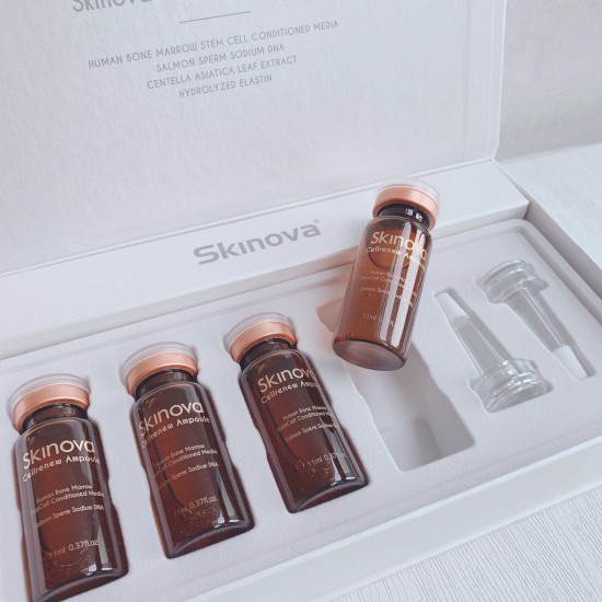 Skinova细胞活力修复安瓶中的干细胞培养液中含有10%的脂质体/财团叶提取物美白祛皱双重功能;积雪草萃取,广泛用于健康,美容和管理。被肌肤吸收后有助于镇静红肿敏感的肌肤。促进胶原蛋白合成,增强皮肤弹性;三酯(triterpene)成分,有助于镇静红肿敏感的肌肤。