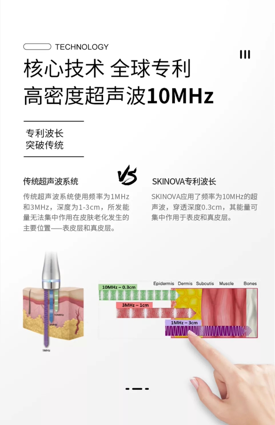 1MHZ波穿透深度是肌肉层,3MHZ穿透深度是真皮层到皮下组织,10MHZ穿透深度是皮下0.3厘米左右,能够准确的作用于真皮层,促进胶原蛋白再生,纤维细胞活性增加转变为成熟的纤维细胞,以此达到修复再生和抗衰的效果。