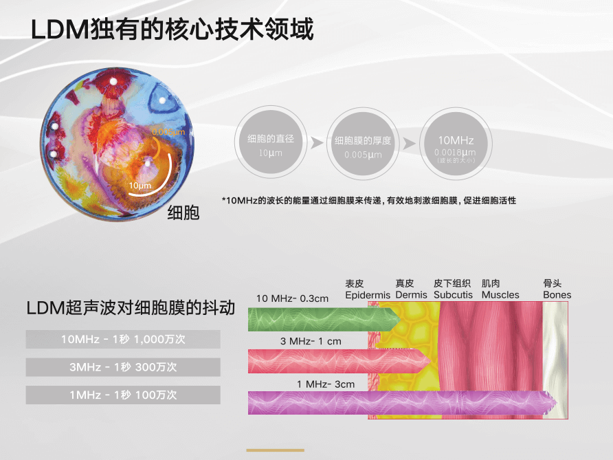 Skinova通过不同频率的声波交叉作用于皮肤内细胞,能穿透皮肤表皮和真皮组织,通过对真皮细胞发出的10MHz高频振动,能刺激皮肤胶原蛋白和纤维细胞的活性,真正做到激活细胞的目的。