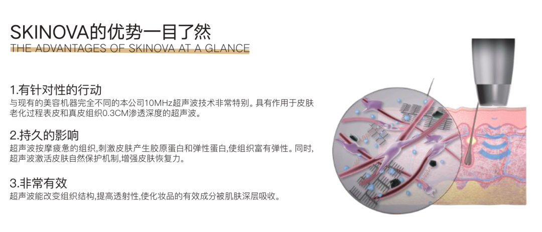 Skinova运用世界唯一核心技术10MHz超音波波长来进行集中性的皮肤治疗和长期管理。在10MHz纳米级震动非热损伤的情况下,刺激浅层细胞,从而最大化超声波能量对细胞产生的物理效果,达到细胞再生,受损细胞修复,再生修复皮肤屏障受损,彻底改善皮肤形态的目的。