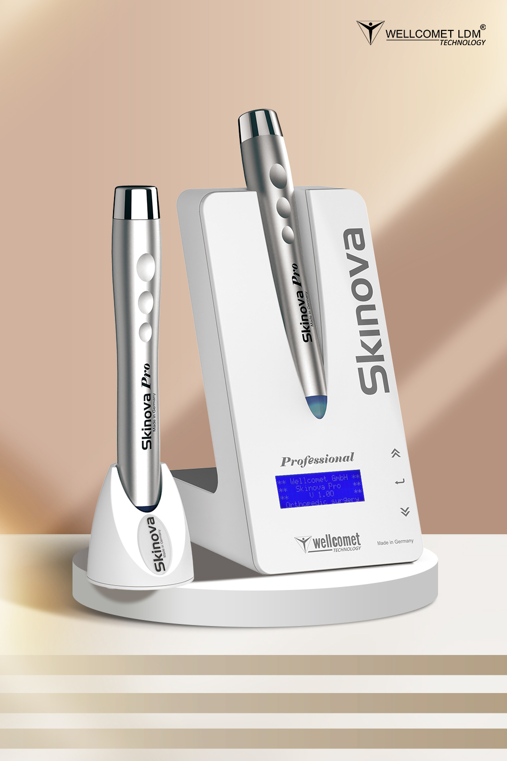 Skinova美容仪是德国技术,发达于韩国,运用的LDM技术使用不同于其他技术的超声波的频率为10 MHz的,大多都通常只用于诊断中的应用。在超过800例皮肤测试(其中一些已被发表)中,LDM的基础理论已在不同的临床研究中得到测试验证。基于双频率超声波,并能够调节细胞外基质的生产和破坏结缔组织内的动态过程。无创无痛没有副作用,却能在不知不觉中,改变皮肤的细腻程度。