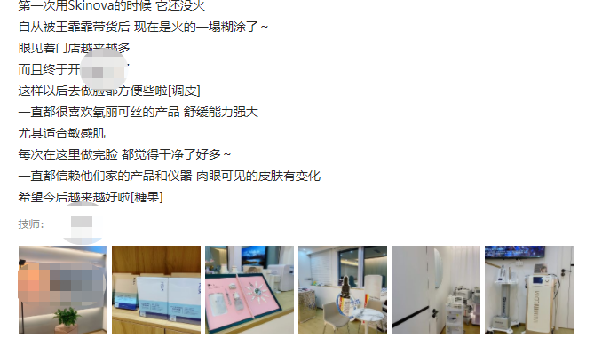 第一次用Skinova的时候 它还没火,自从被王霏霏带货后 现在是火的一塌糊涂了~眼见着门店越来越多 而且终于开来我这附近了,这样以后去做脸都方便些啦! 一直都很喜欢Skinova产品 舒缓能力强大,尤其适合敏感肌,每次在这里做完脸都觉得干净了好多~一直都信赖他们家的产品和仪器,肉眼可见的皮肤有变化,希望今后越来越好啦!