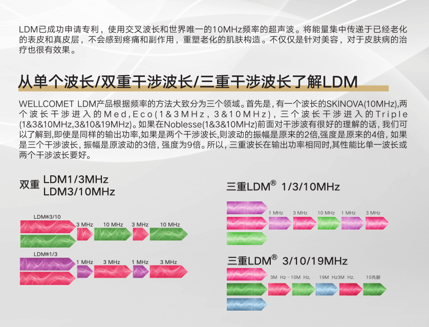 Skinova美容仪使用已成功申请专利LDM技术,使用交叉波长和世界唯一的10MHz频率的超声波。将能量集中传递于已经受损的表皮和真皮层,不会感到疼痛和副作用,重塑受损的肌肤构造。不仅仅是针对美容,对于皮肤病的修复也很有效果。