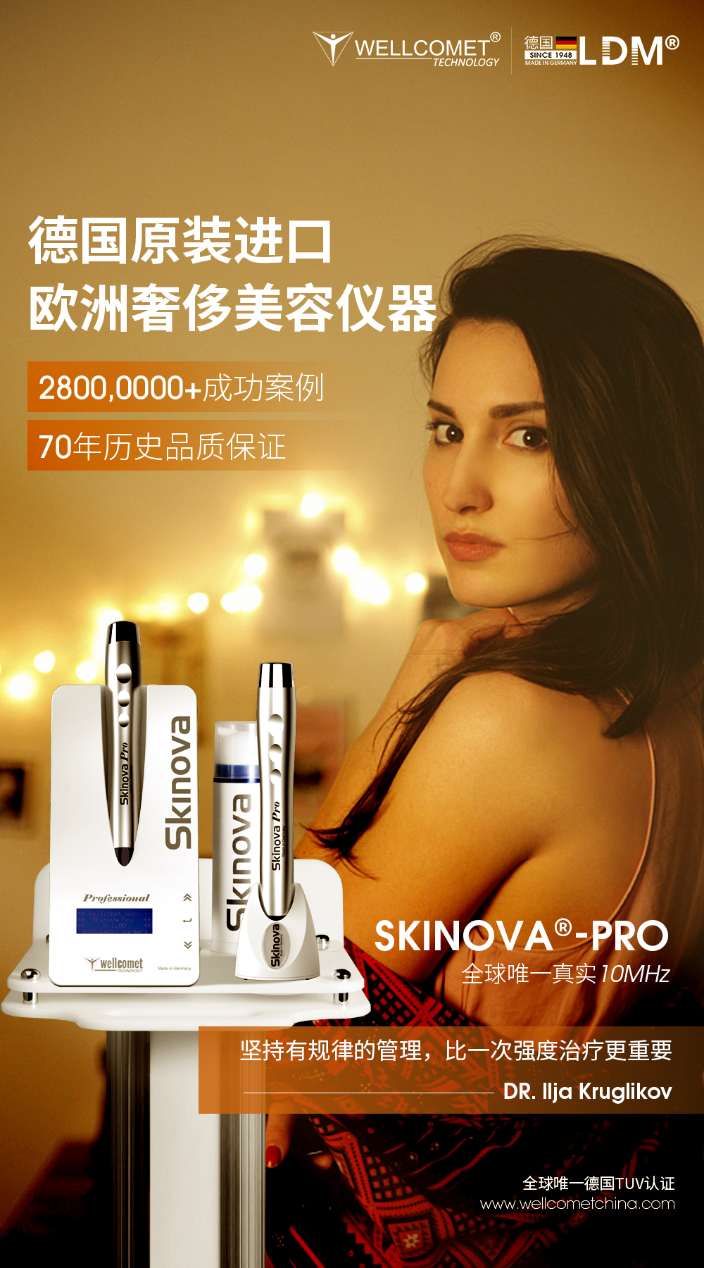 Skinova美容仪,是德国LDM水滴提升的家用版,Skinova仪器有两个版本,今天我们要讲的是Skinova Pro这一款小仪器吧,Skinova Pro跟水滴提升一样,都是全球唯一一款拥有高密度超声波技术的仪器,一秒钟达到一千万次的震动振幅,密度比细胞膜还细,穿透到每一个细胞,平衡各类细胞机制,让皮肤回到年轻健康的状态。