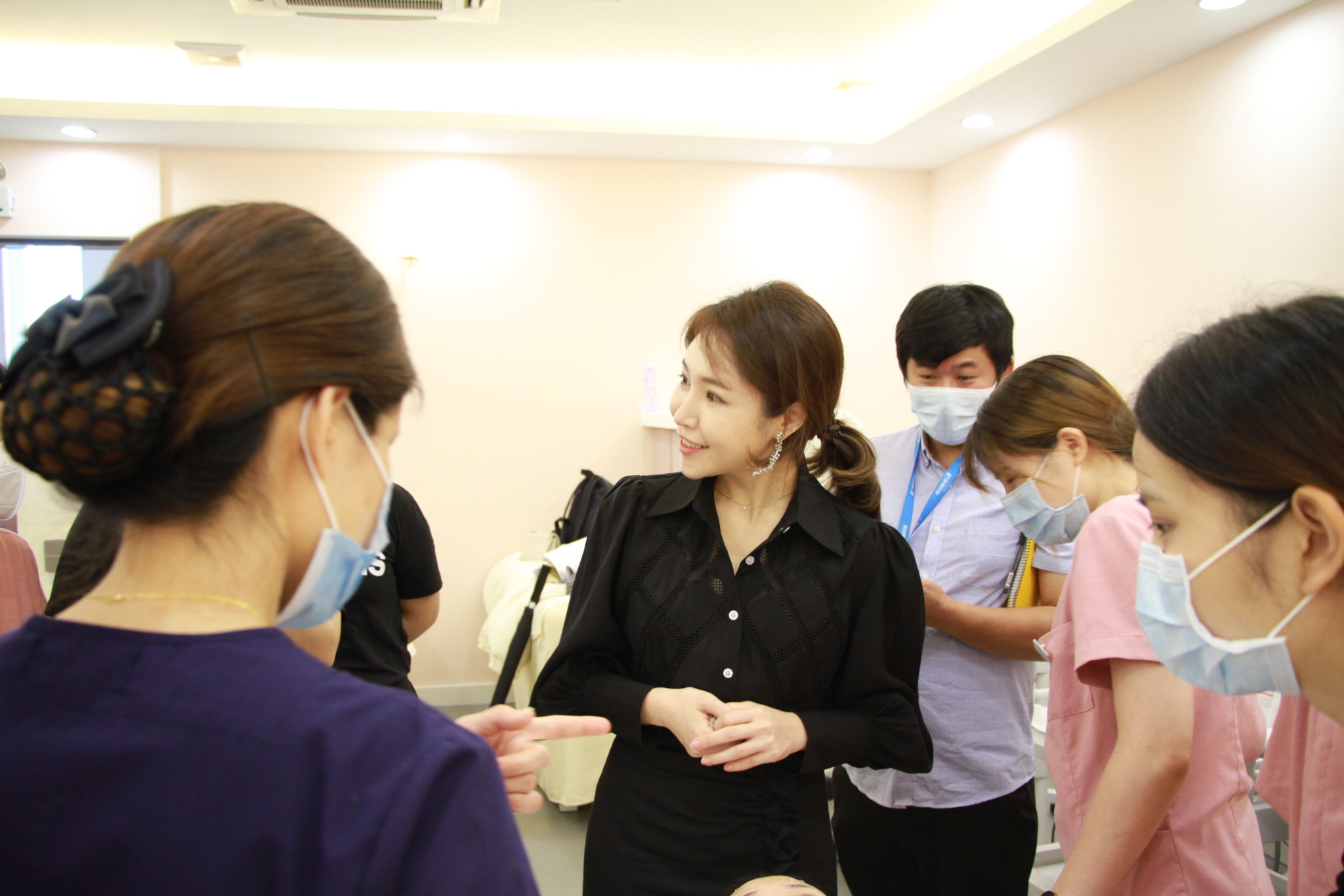 图为:金京熹小姐与奥园健康旗下医疗美容机构奥若拉员工进行交流探讨并且耐心解答