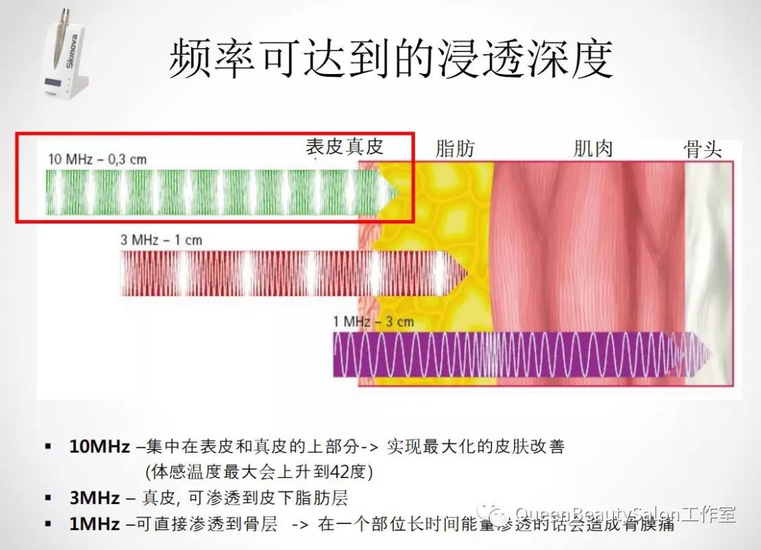 Skinova美容仪区别于传统的超声波美容仪器(频率为1MHz和3MHz的超声设备),Skinova 拥有的10MHz波长能量比细胞膜的厚度更小,10 MHz的声波频率具有150 m的极小波长,因此影响单个细胞或组织内的小细胞组,这意味着10MHz频率的超声波对任何的细胞产生非常具体的反应。可有效调节真皮上层部的细胞活性和细胞外基质的平衡,改善老化皮肤。